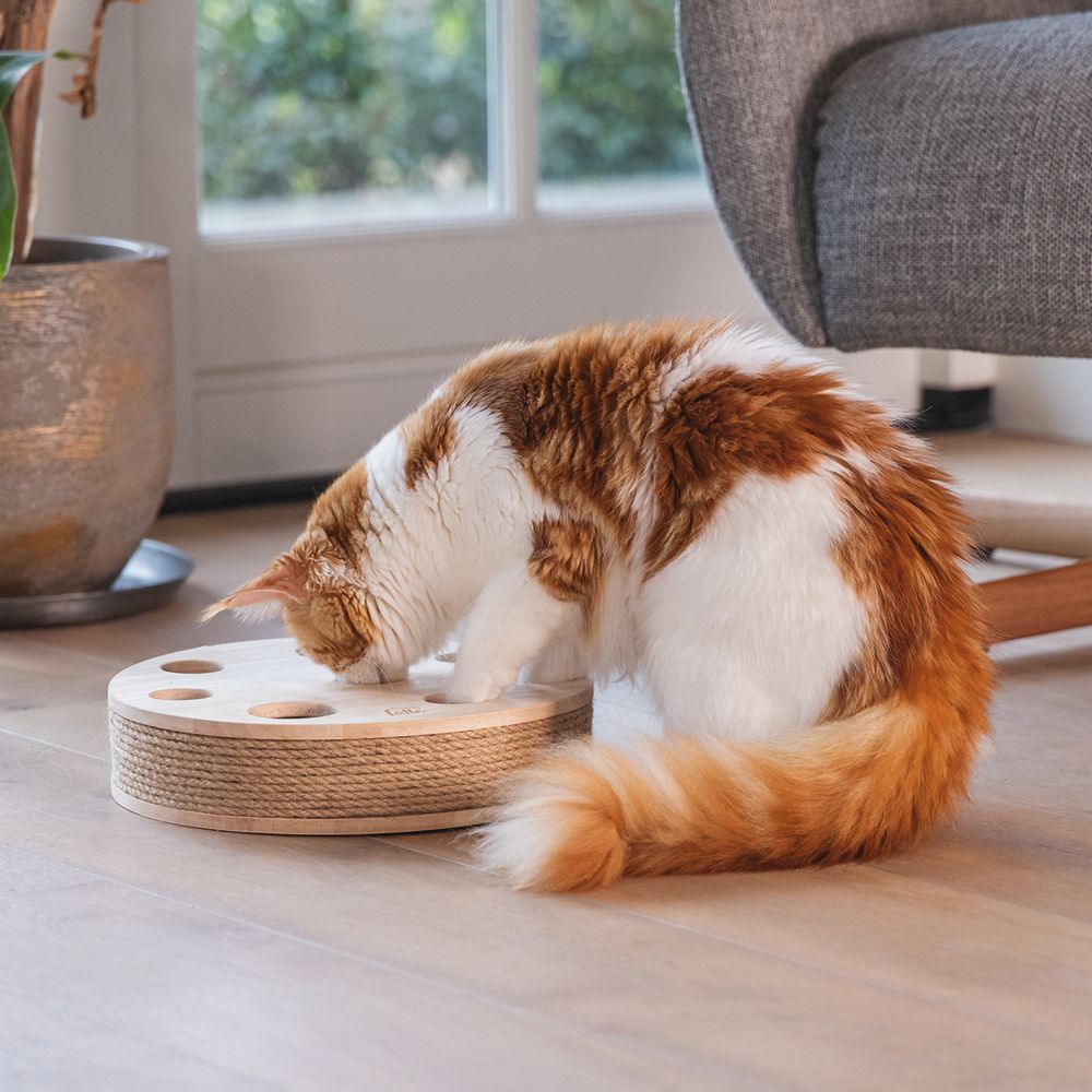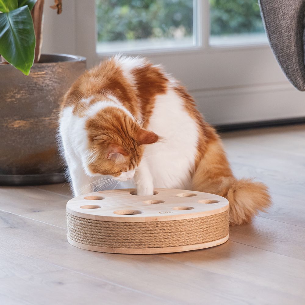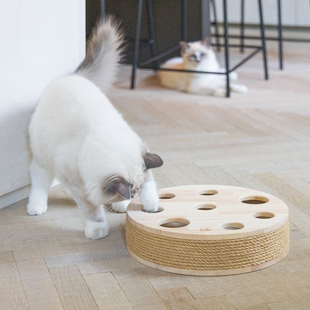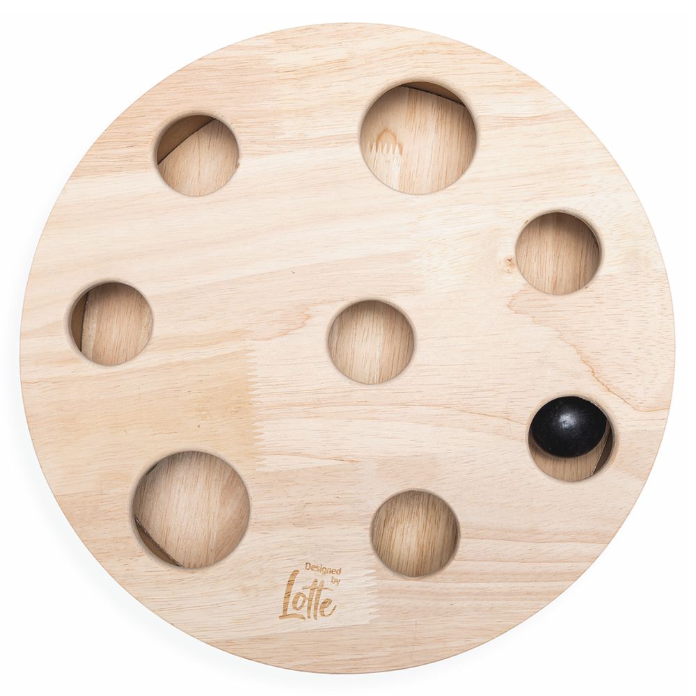 Katzen lieben es zu spielen! Das Katzenspielzeug RAYA von Designed by Lotte wird deine Katze endlos unterhalten. Dieses ansprechende Spielzeug verfügt oben über mehrere Öffnungen, durch die deine Katze die beiden im Inneren versteckten Holzkugeln bewegen kann. Sie wird es genießen, den Kugeln hinterherzujagen und sie einzufangen. Katzen können damit stundenlang alleine spielen, du kannst aber auch mitmachen und den Spaß für deine Katze steigern. Ein integriertes Kratzteil außen ermöglicht es deiner Katze, spielerisch ihre Krallen zu pflegen und trägt somit auch zum Schutz deiner Möbel bei. Das Katzenspielzeug RAYA ist aus Rubberwood und hat natürliche Farben, sodass es in jeder Einrichtung ein optisches Highlight ist.