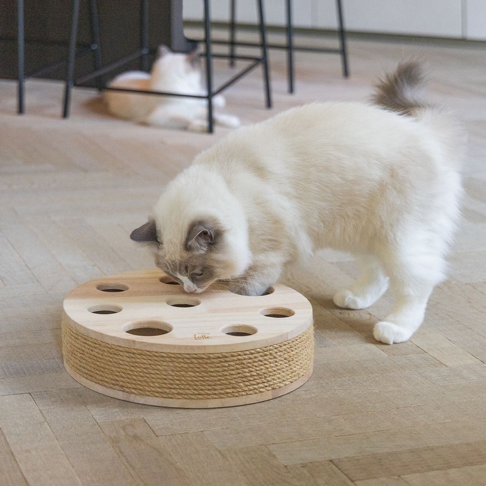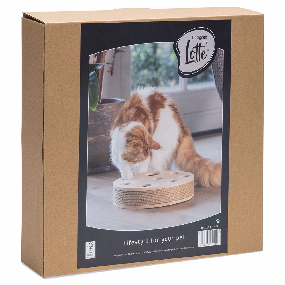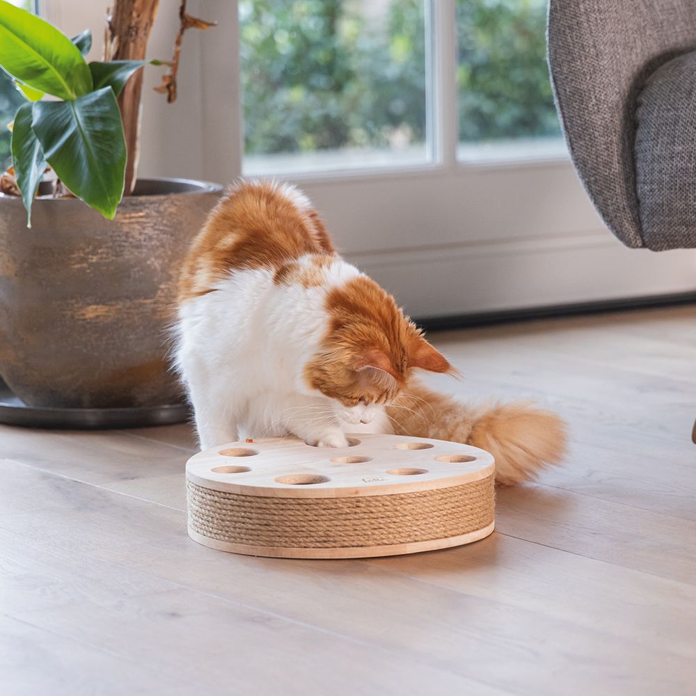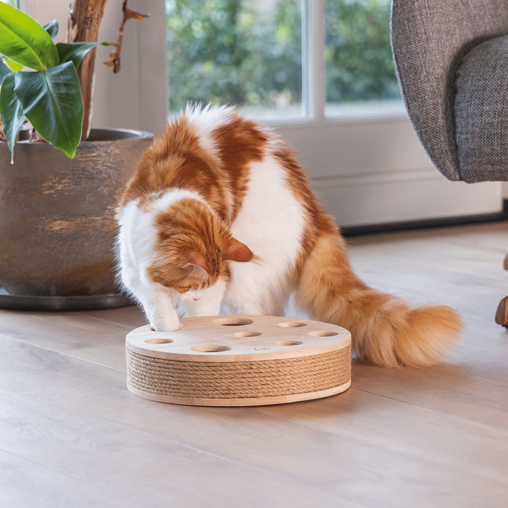 Katzen lieben es zu spielen! Das Katzenspielzeug RAYA von Designed by Lotte wird deine Katze endlos unterhalten. Dieses ansprechende Spielzeug verfügt oben über mehrere Öffnungen, durch die deine Katze die beiden im Inneren versteckten Holzkugeln bewegen kann. Sie wird es genießen, den Kugeln hinterherzujagen und sie einzufangen. Katzen können damit stundenlang alleine spielen, du kannst aber auch mitmachen und den Spaß für deine Katze steigern. Ein integriertes Kratzteil außen ermöglicht es deiner Katze, spielerisch ihre Krallen zu pflegen und trägt somit auch zum Schutz deiner Möbel bei. Das Katzenspielzeug RAYA ist aus Rubberwood und hat natürliche Farben, sodass es in jeder Einrichtung ein optisches Highlight ist.