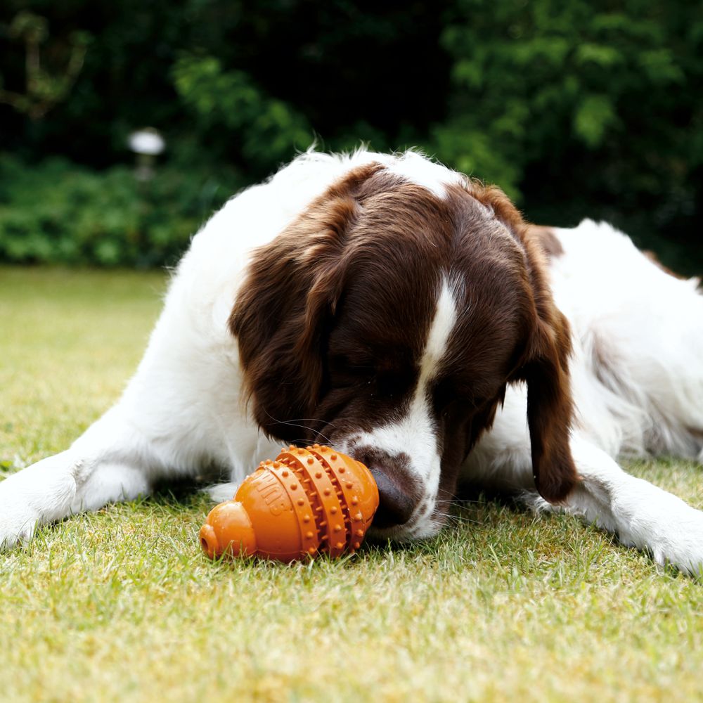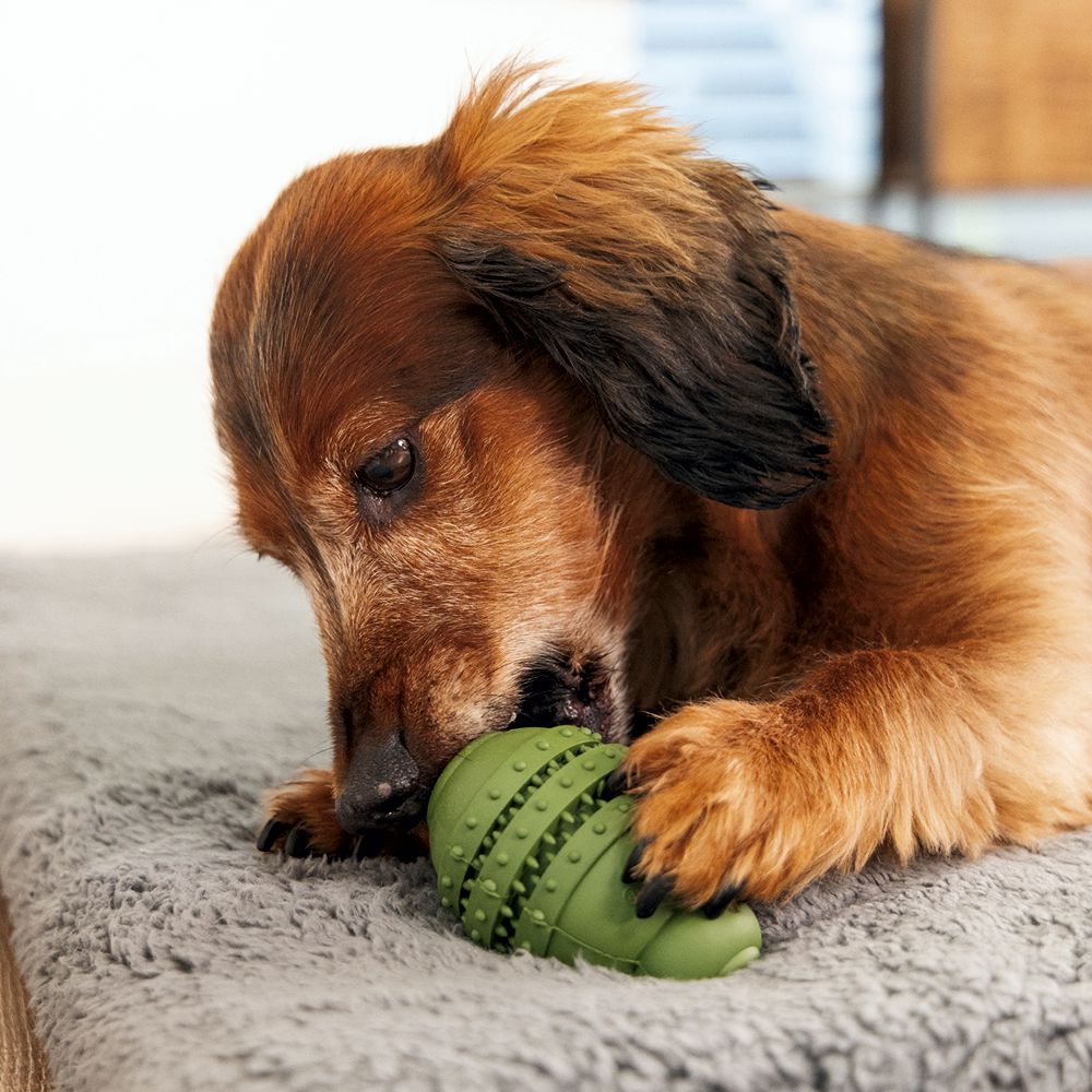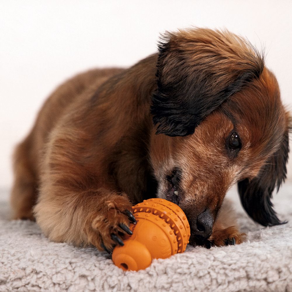 Dank des Materials und durch seine besondere Form springt und hüpft der SUMO PLAY DENTAL völlig unvorhersehbar in alle möglichen Richtungen, was für Aufmerksamkeit und anhaltende Spielfreude sorgt. Das Material fühlt sich in der Schnauze weich und gut an und das Tier kaut gerne darauf herum. Außerdem ist es extrem robust und haltbar. Der SUMO PLAY DENTAL ist wegen seiner vielfältigen Anwendungsmöglichkeiten beliebt beim Menschen und unwiderstehlich für den Hund: Er kann mit Leckerchen, Leberwurst, Snack-Creme, usw. befüllt werden, eignet sich hervorragend für Wurf-, Versteck- und Jagdspiele und ist natürlich perfekt zum Apportieren. Durch die Rillen und Noppen außen werden beim darauf Herumkauen die Zähne gereinigt und Zahnfleisch & Gaumen massiert. Der SUMO PLAY DENTAL kann sogar in der Spülmaschine gereinigt werden. Er ist in drei verschiedenen Größen und den Farben orange und grün erhältlich.