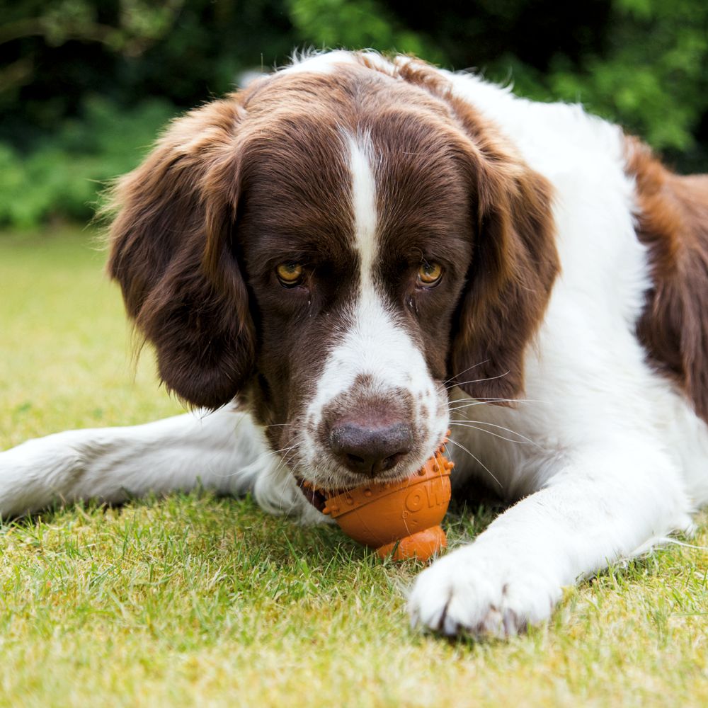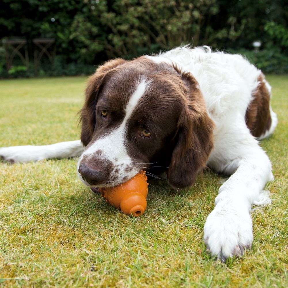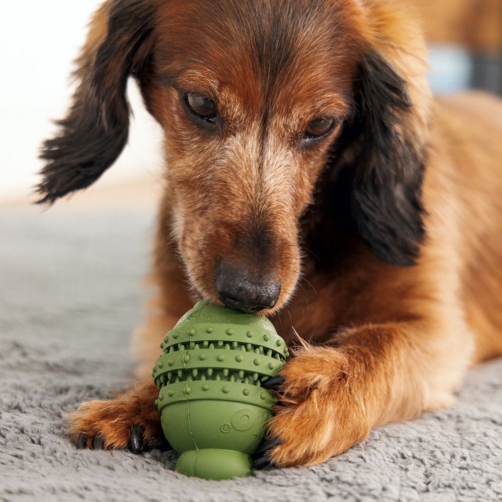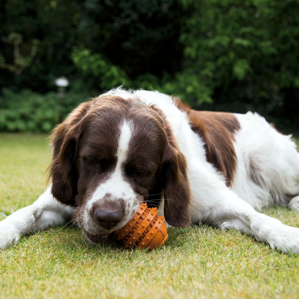 Dank des Materials und durch seine besondere Form springt und hüpft der SUMO PLAY DENTAL völlig unvorhersehbar in alle möglichen Richtungen, was für Aufmerksamkeit und anhaltende Spielfreude sorgt. Das Material fühlt sich in der Schnauze weich und gut an und das Tier kaut gerne darauf herum. Außerdem ist es extrem robust und haltbar. Der SUMO PLAY DENTAL ist wegen seiner vielfältigen Anwendungsmöglichkeiten beliebt beim Menschen und unwiderstehlich für den Hund: Er kann mit Leckerchen, Leberwurst, Snack-Creme, usw. befüllt werden, eignet sich hervorragend für Wurf-, Versteck- und Jagdspiele und ist natürlich perfekt zum Apportieren. Durch die Rillen und Noppen außen werden beim darauf Herumkauen die Zähne gereinigt und Zahnfleisch & Gaumen massiert. Der SUMO PLAY DENTAL kann sogar in der Spülmaschine gereinigt werden. Er ist in drei verschiedenen Größen und den Farben orange und grün erhältlich.