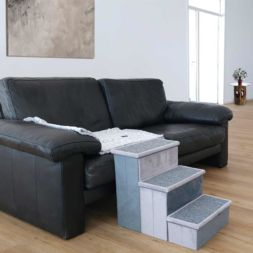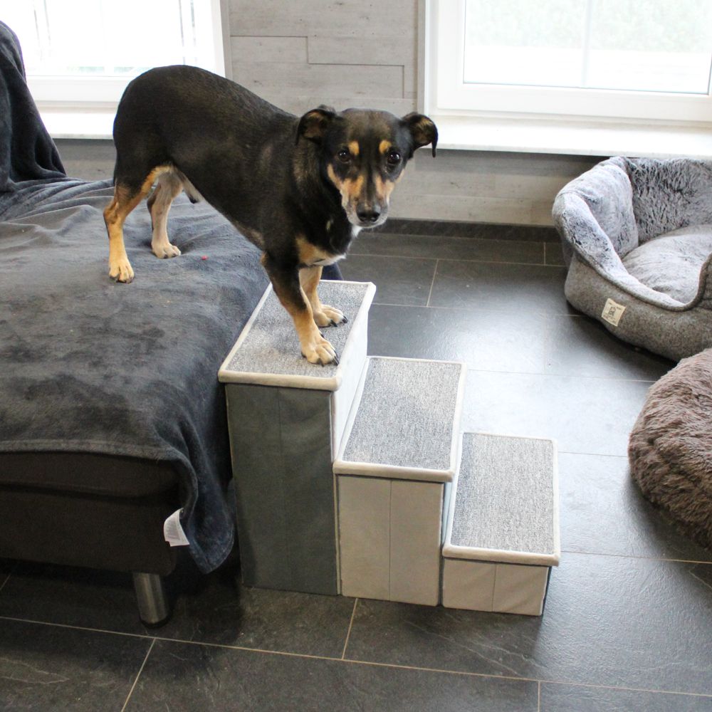 Die Haustiertreppe SCADA von Nobby erleichtert kleinen, kranken oder älteren Hunden und Katzen das Leben, wenn sie höher gelegene Plätze wie z.B. Sofa oder Bett erreichen wollen. Ideal ist sie natürlich auch für gesunde Tiere, um die Gelenke zu schonen.