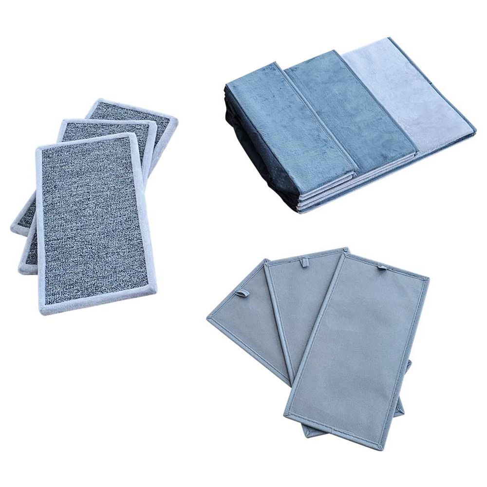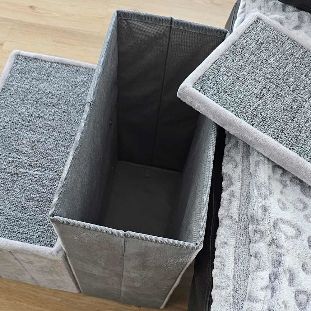 Die stilvolle Treppe ist mit einem samtähnlichen Stoff in elegantem grau bezogen und fügt sich damit in nahezu jede Wohnungseinrichtung perfekt ein. Die Laufflächen sind für eine gute Trittsicherheit mit Teppich belegt. Die Treppe bietet in den Stufen praktischen Stauraum und ist vollständig zusammenfaltbar, was eine platzsparende Aufbewahrung ermöglicht.